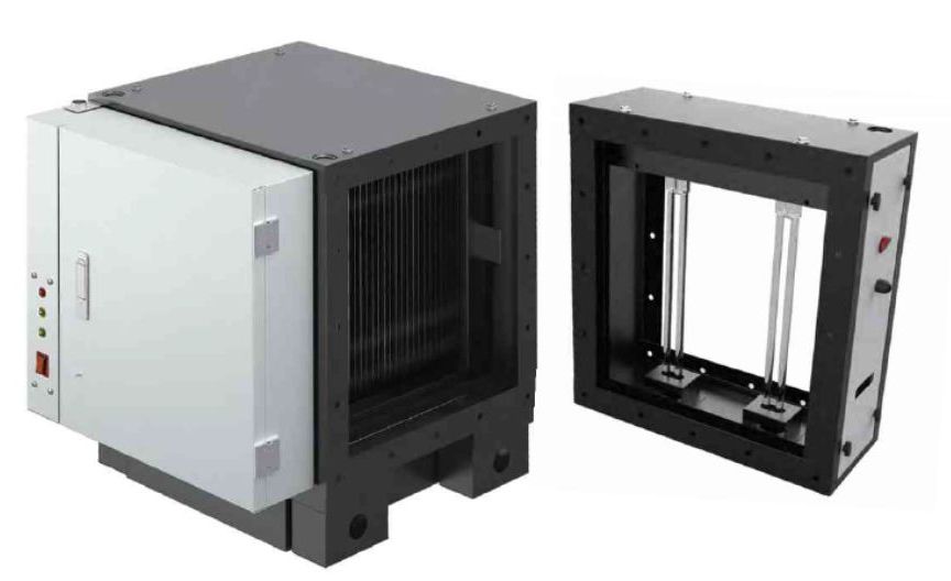 einen großen Anwendungsbereich im Bereich der Abluftreinigung in Lebensmittelindustie und Gastronomie perfekt angepasst ist. Die Einheit mit kompakter Bauform wird im Abluftkanal eingefügt.